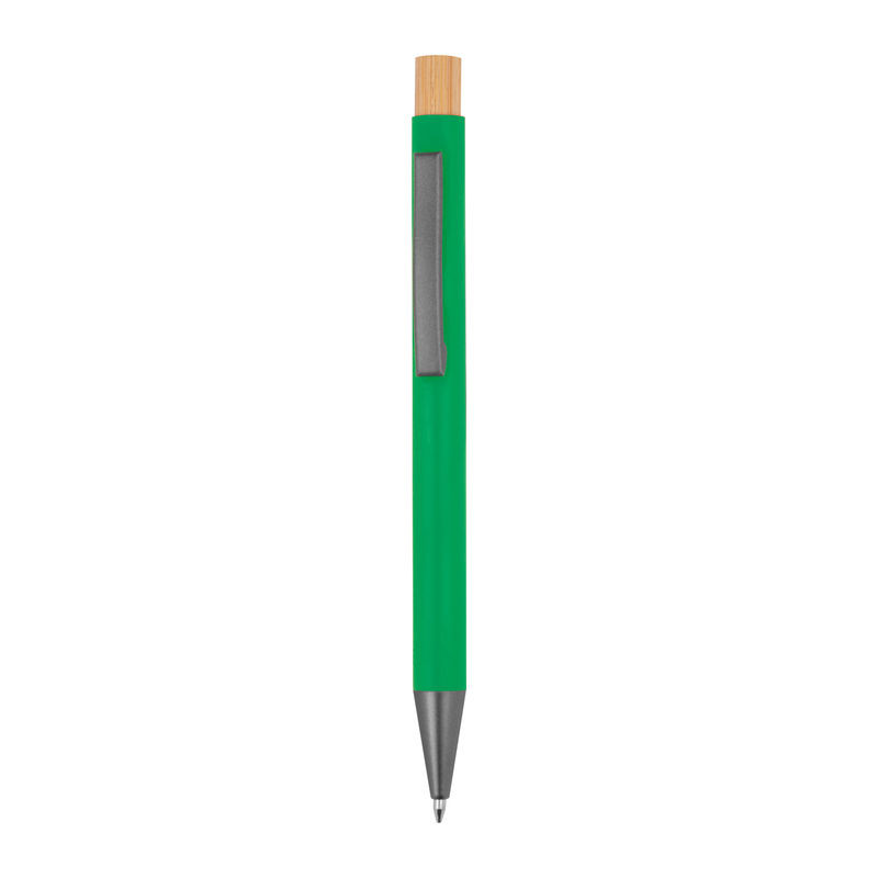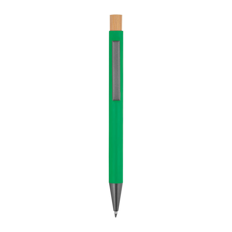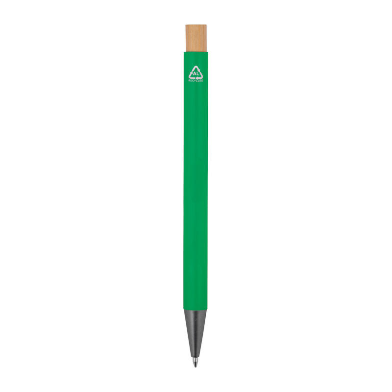 Újrahasznosított alumíniumból készült golyóstoll bambusz nyomógombbal, matt fém klipszszel és kék színű, jumbo tollbetéttel.