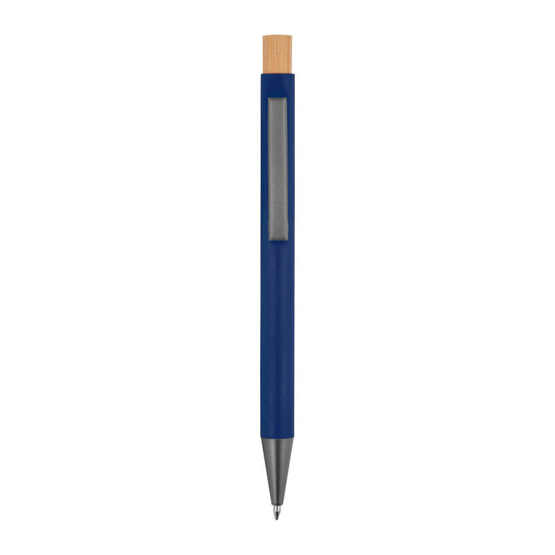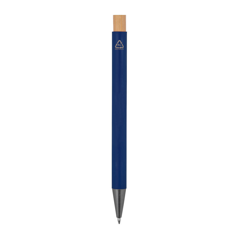 Újrahasznosított alumíniumból készült golyóstoll bambusz nyomógombbal, matt fém klipszszel és kék színű, jumbo tollbetéttel.