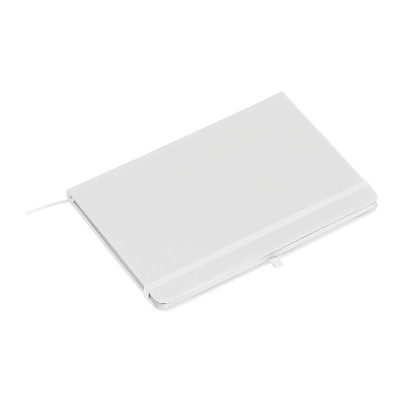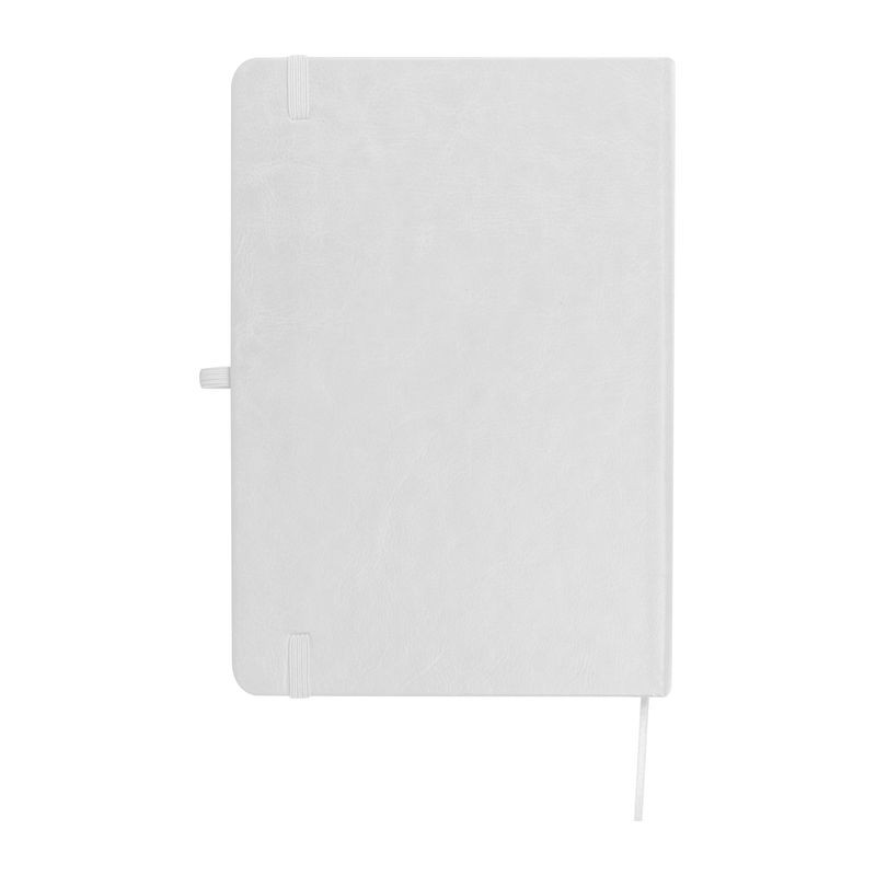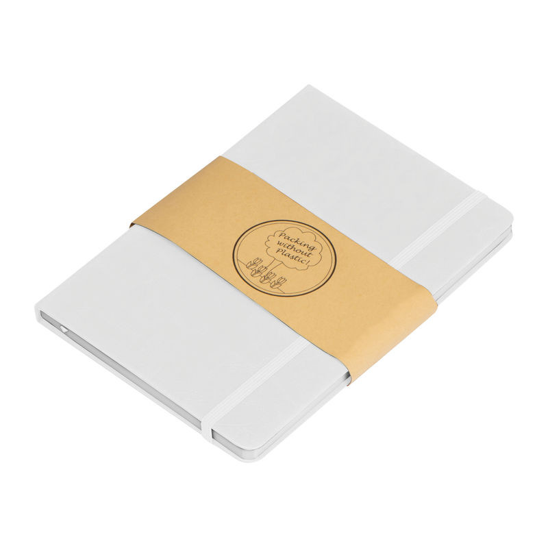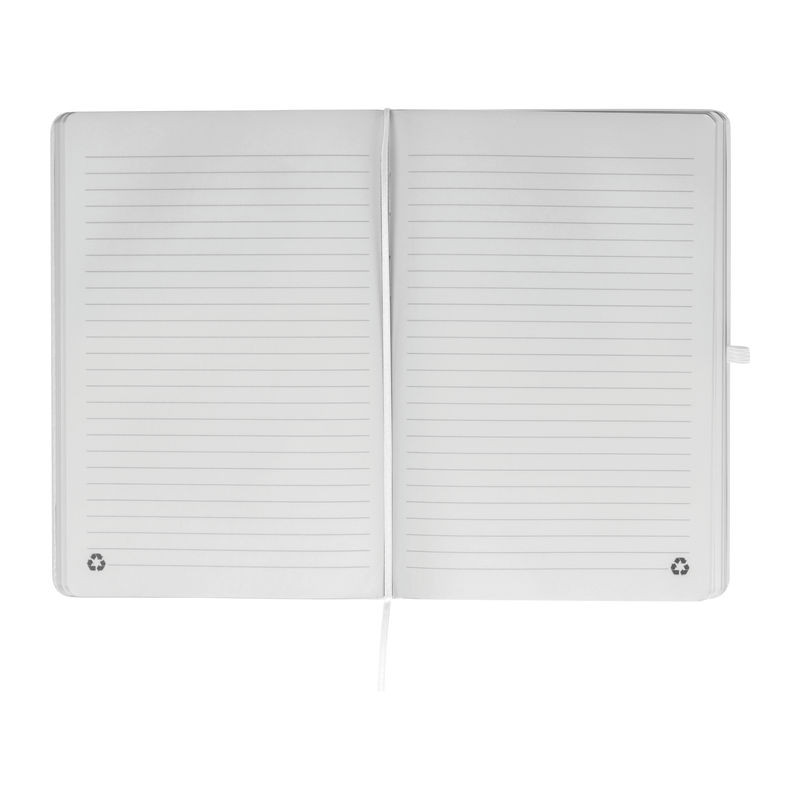 Újrahasznosított A5-ös notesz PU borítással, 192 vonalas oldallal, tolltartó hurokkal és gumipánttal a záráshoz.