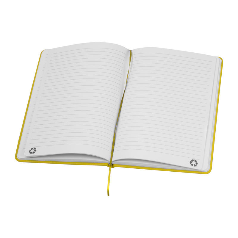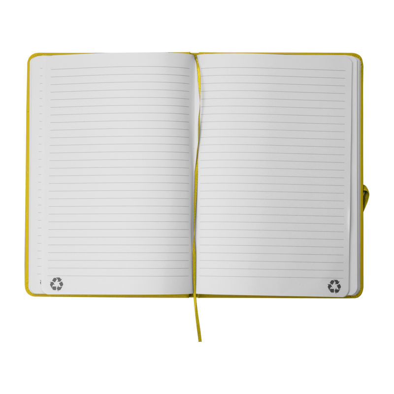 A5 méretű jegyzetfüzet újrahasznosított PU-borítóval és 160 vonalas oldallal, mely újrahasznosított papírból készült.