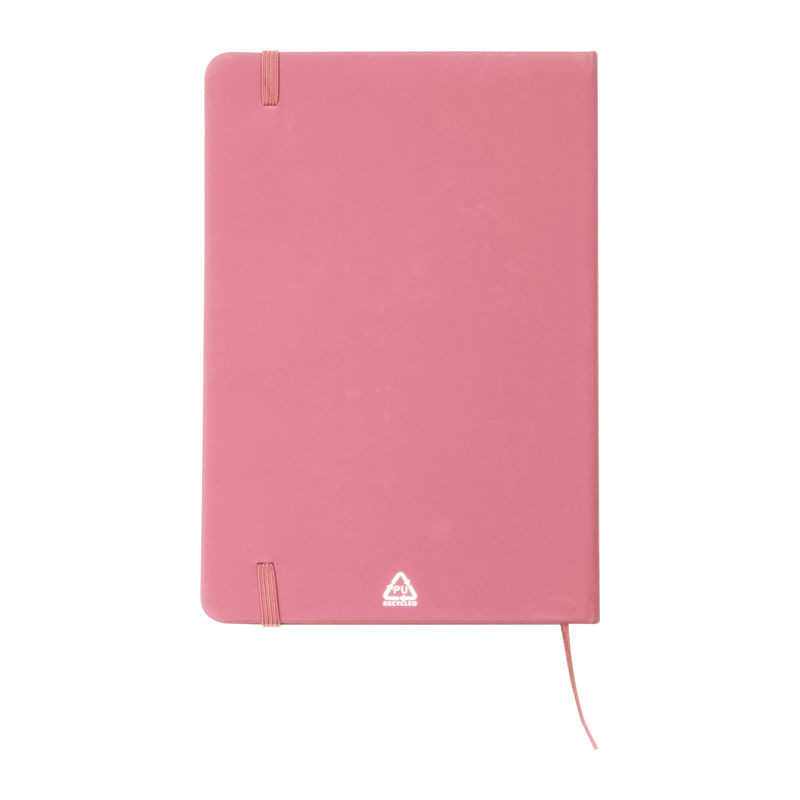 A5 méretű jegyzetfüzet újrahasznosított PU-borítóval és 160 vonalas oldallal, mely újrahasznosított papírból készült.