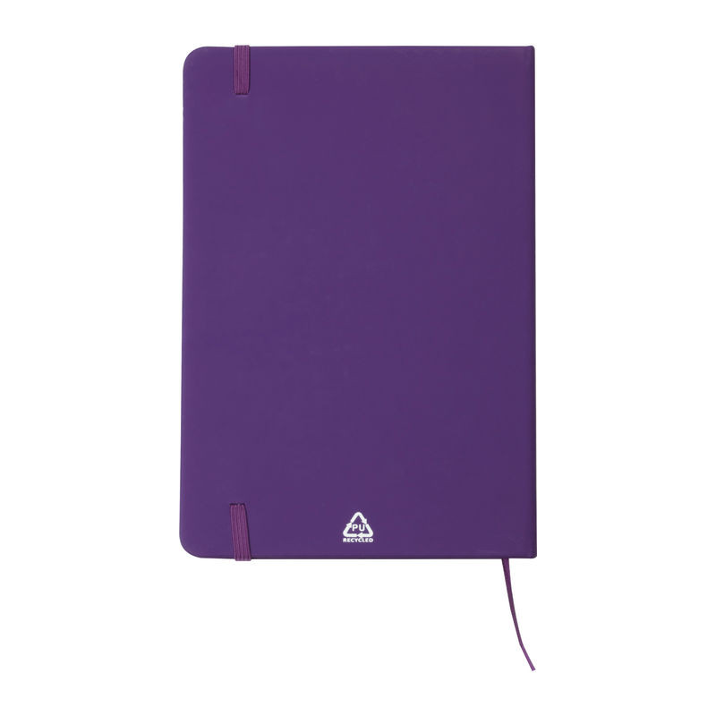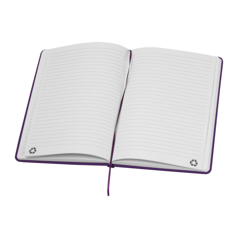 A5 méretű jegyzetfüzet újrahasznosított PU-borítóval és 160 vonalas oldallal, mely újrahasznosított papírból készült.