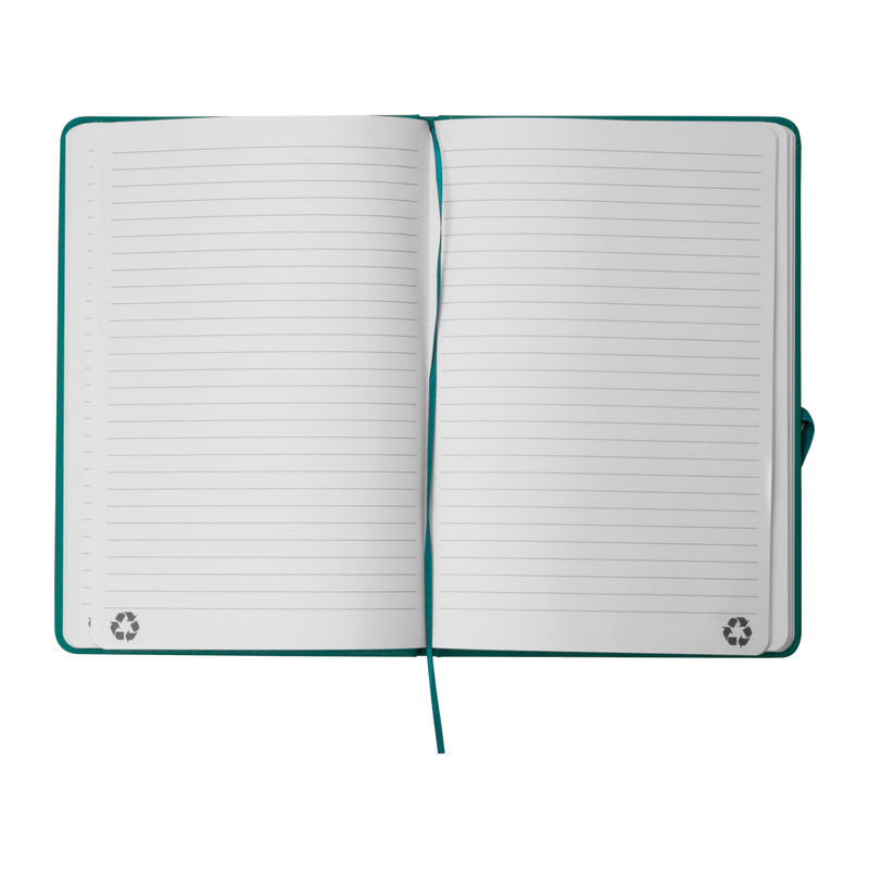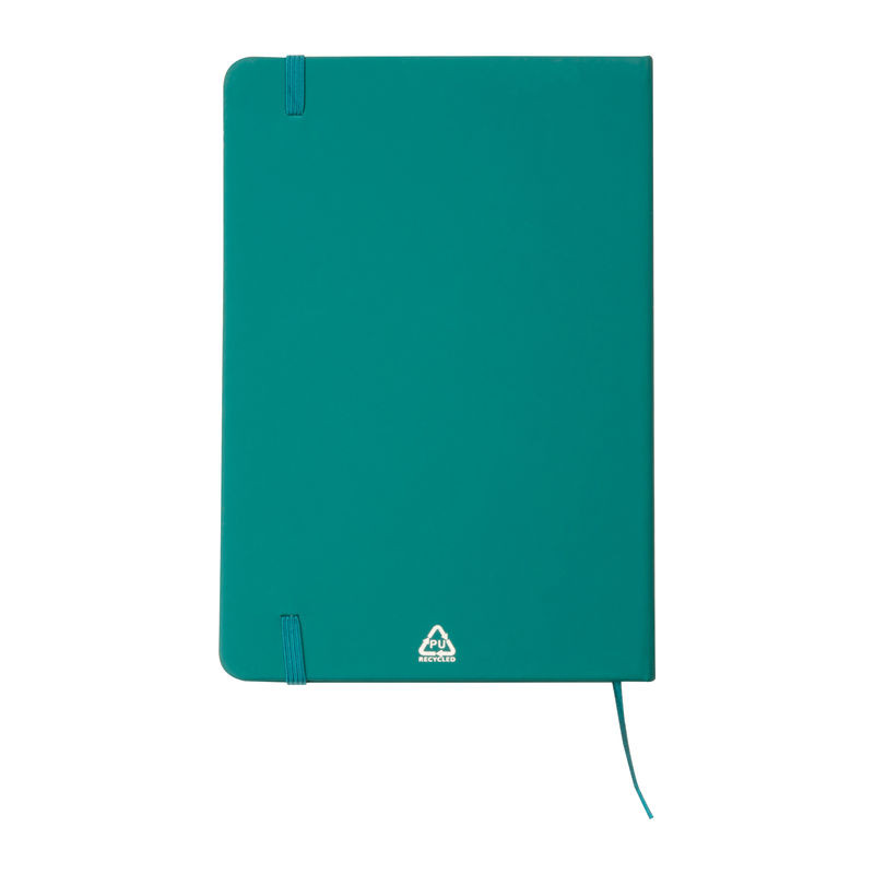 A5 méretű jegyzetfüzet újrahasznosított PU-borítóval és 160 vonalas oldallal, mely újrahasznosított papírból készült.