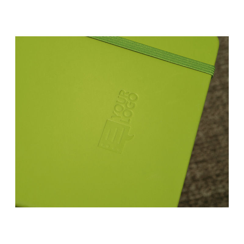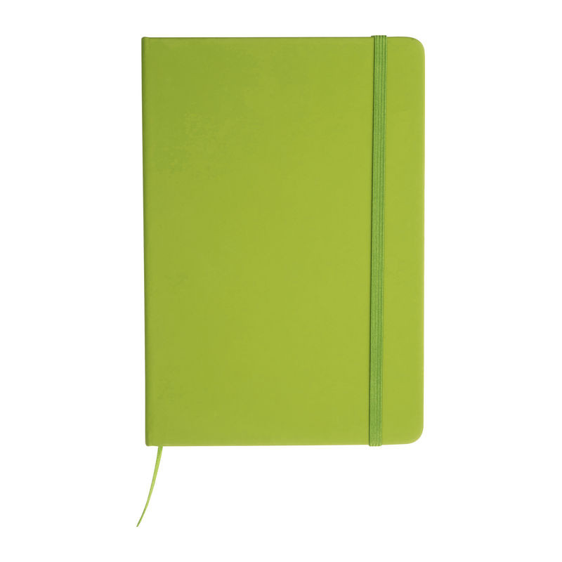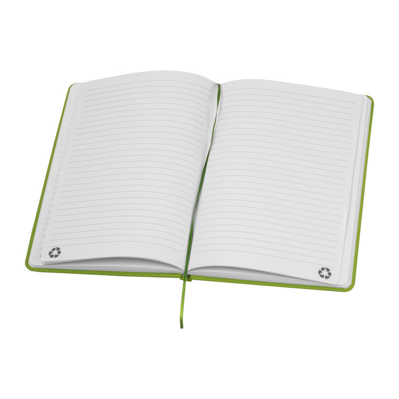 A5 méretű jegyzetfüzet újrahasznosított PU-borítóval és 160 vonalas oldallal, mely újrahasznosított papírból készült.
