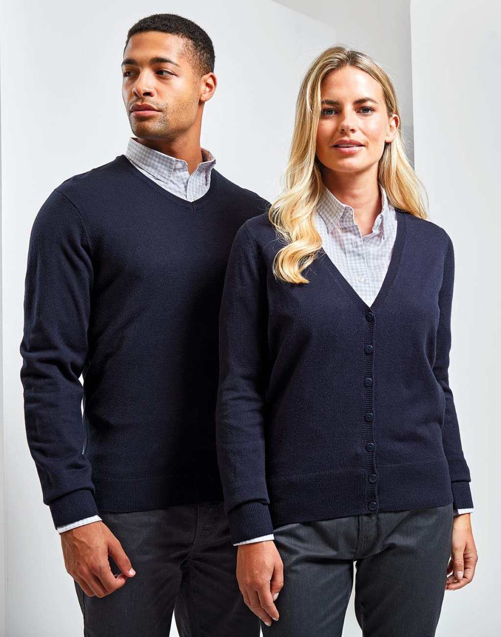 Fabric 100% Acrylic 12 gauge knit Features Ribbed knit neck. hem. and cuffs Contemporary V-neck styling Fine knit Soft feel Easy care