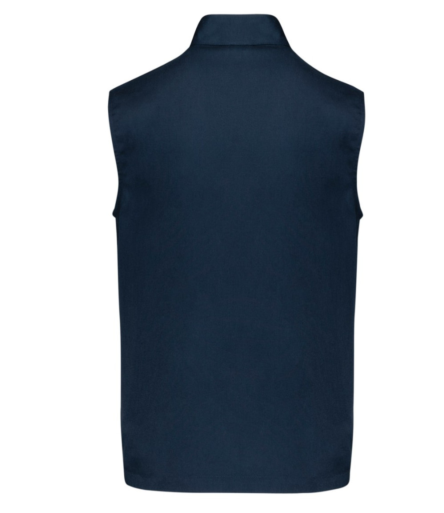 Férfi mellény, divatos csíkkal a váll részen. 60 fokon mosható, erős anyag. A jobb oldalon 1 nyitott mellzseb tolltartóval, belül 1 névcímkével, amely alapján könnyen azonosítható a tulajdonosa, így céges munkaruházatnak kiváló.
